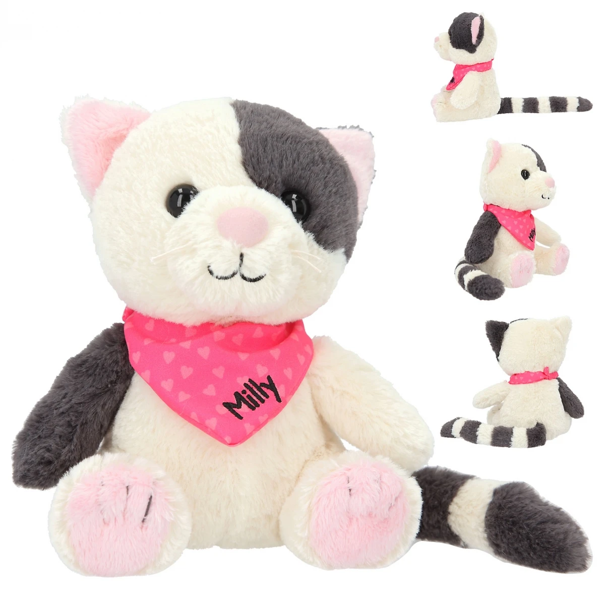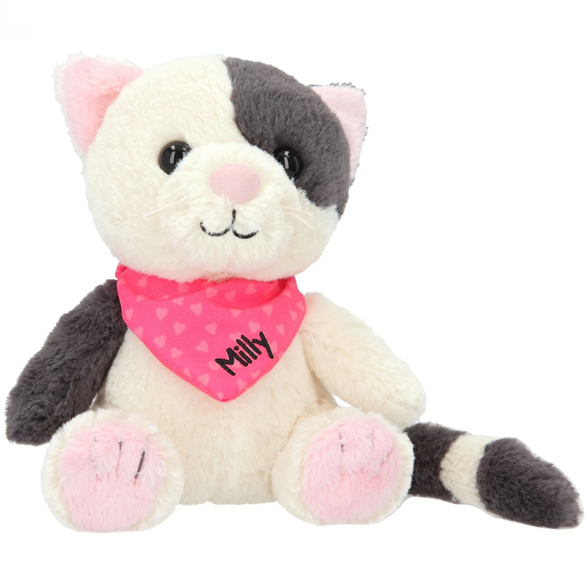 Unglaublich weich und superniedlich: Die Kuschel-Katze Milly hat schwarz-weißes Plüschfell, dunkle Knopfaugen und ein pinkes Halstuch, auf dem ihr Name gestickt ist.